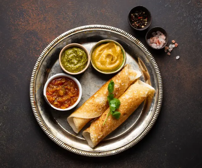 Our signature dish featuring a thin, crispy crepe made fresh on the tawa, filled with perfectly spiced potato masala. Served with aromatic coconut chutney and flavorful sambar (lentil soup). This classic South Indian delicacy is naturally gluten-free and vegetarian, offering authentic flavors in every crispy bite.
